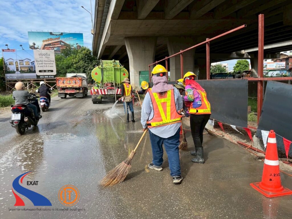 ทำความสะอาดผิวถนนทางเข้า-ออก พื้นที่งานก่อสร้าง
